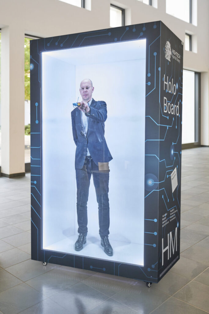 Für aufgezeichnete Lehrinhalte wird das klassische Lightboard zum Holoboard weiterentwickelt. Lehrende schreiben auf einer transparenten Glasfläche und können gleichzeitig digitale Elemente wie Animationen oder Videos einblenden. Ein infrarotgesteuerter Touchscreen macht das Board interaktiv nutzbar. So entsteht eine immersive, visuell ansprechende Lernumgebung, die das Engagement der Lernenden in asynchronen Formaten deutlich steigert.