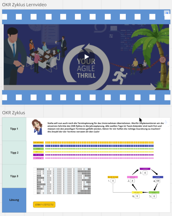 Den Ausgangspunkt bildete das Format „3h Scrum“, ein praxisnahes Lehrkonzept, das in agile Arbeitsweisen einführt. Aufbauend darauf entstand während der Corona-Pandemie das digitale Format „Your Agile Thrill“, ein Edu-Escape-Room, der agile Prinzipien vermittelt. Das Portfolio wurde u. a. ergänzt durch einen Edu-Breakout auf Basis der Spiele-Software Minetest sowie durch interaktive Escape Games mit der Online-Plattform Genially. Die daraus resultierende Methodenvielfalt bildet die Grundlage für das übergreifende Modell „Scrum in der Lehre“.